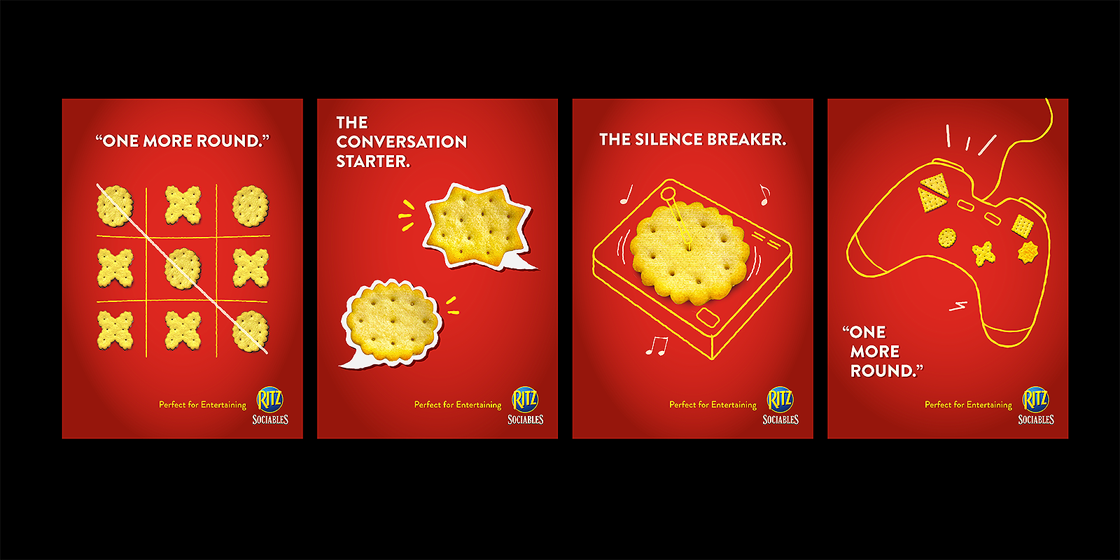 A visual metaphor mini-campaign for Ritz Sociables, positioning it as the perfect snack for entertaining.